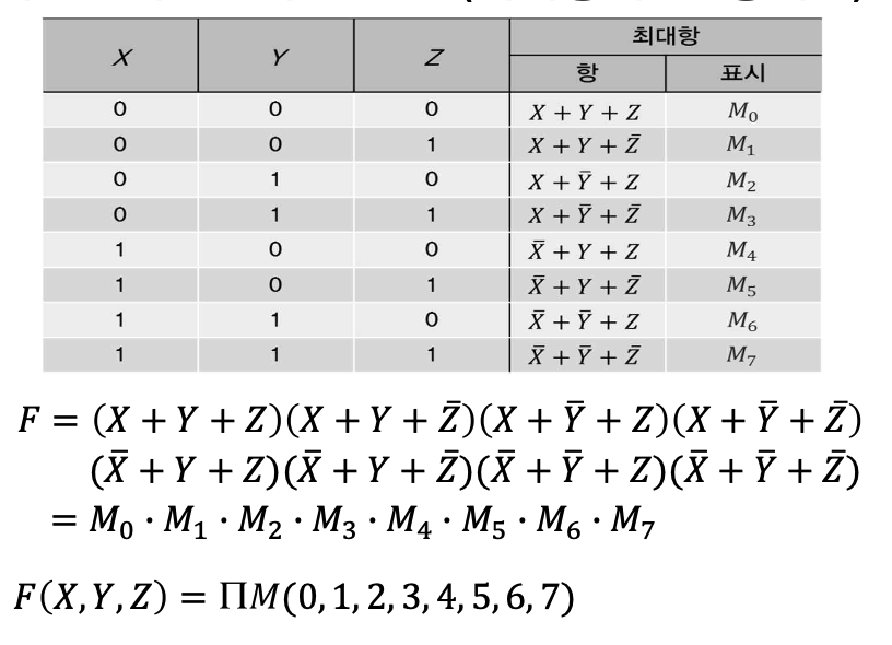 -> 최대항 : 최소항의 쌍대 : 논리합(OR)로 표현되는 결과가 논리 0