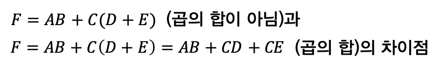 첫 번째 식은 곱의 합 형태가 아니다. 왜냐하면 항 (D+E)는 합의 형태이지 단일 변수가 아니기 때문.