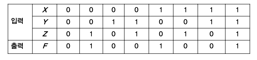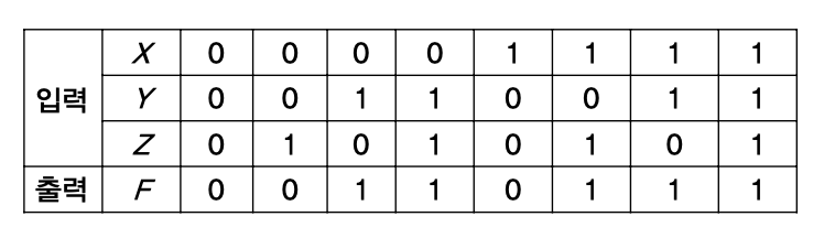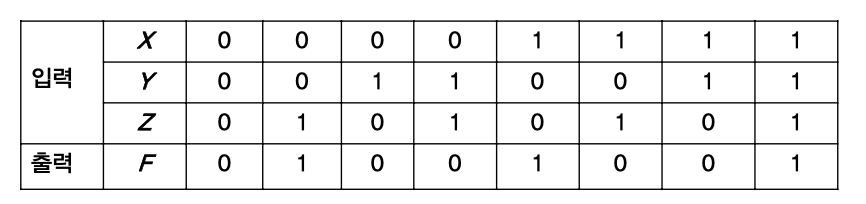 최소항, 즉, 출력 F가 1이 되기 위해서는 0 0 1, 1 0 0, 1 1 1 중 하나이면 된다.