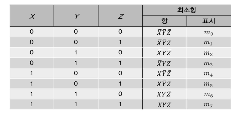 -> 최소항: 논리곱 (AND)로 표현되는 XY, X~Y, ~XY, ~X~Y의 네가지 항(그 결과가 논리 -> 1)