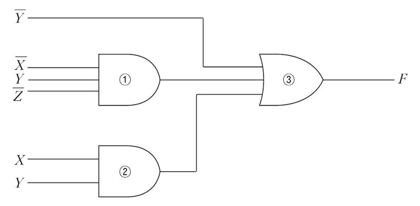표준형 곱의 합으로 표현된 F = ~Y + ~XY~Z + XY의 논리회로도를 표현하면 다음과 같다.