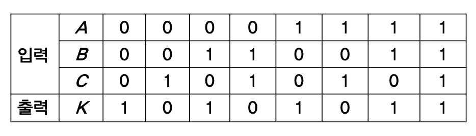 다음 진리표를 갖고 간소화된 논리회로도를 작성해보자.