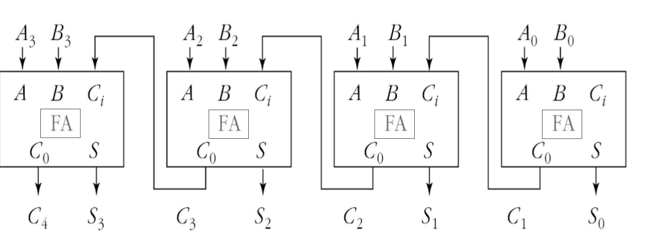 4비트 2진수를 더하는 병렬가산기를 구성하면 FA가 4개 구성되어 있다.