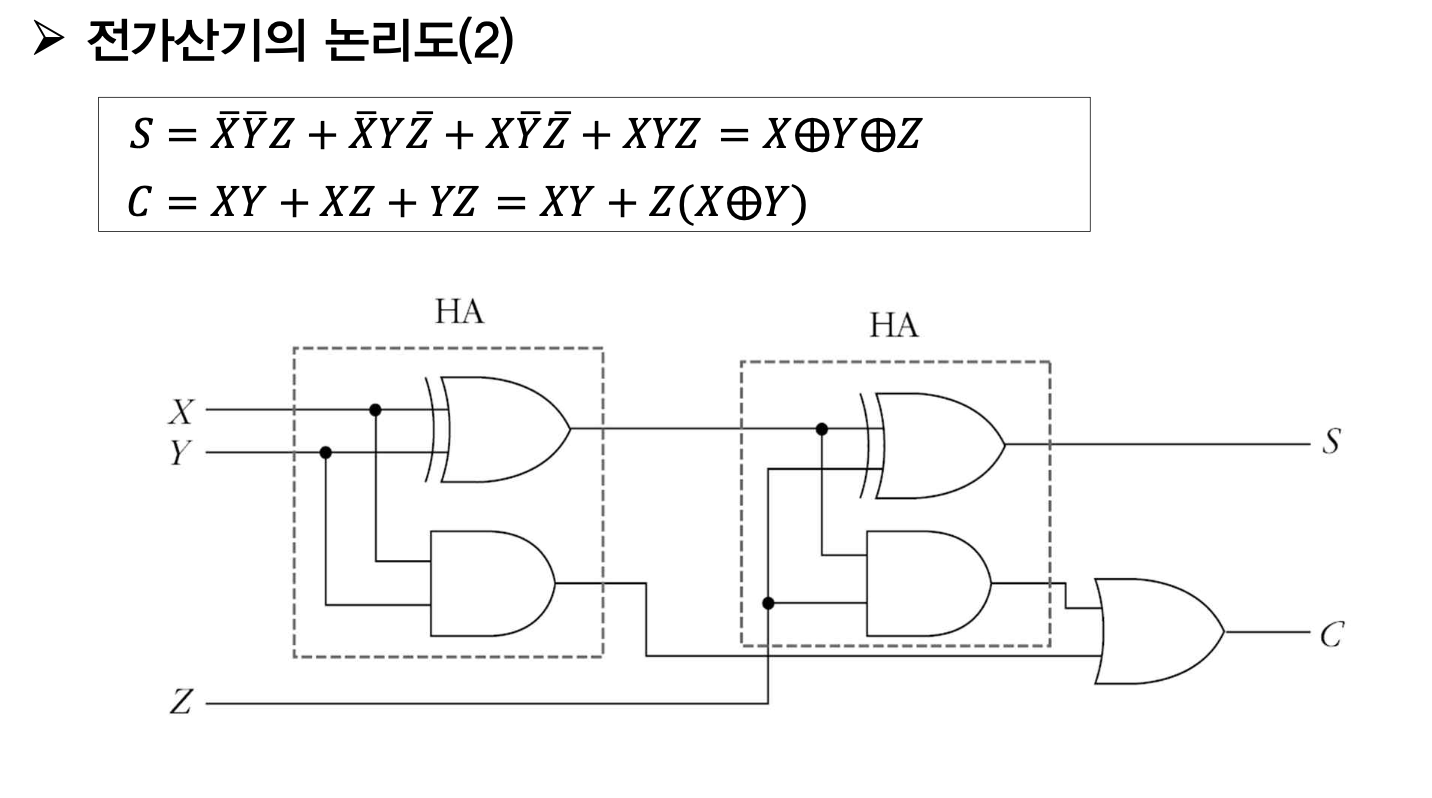 - 전가산기(FA: Full Adder): 세 비트의 덧셈을 수행
