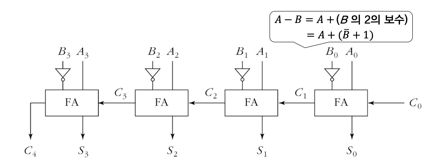 이론적으로 뺄셈은 가산기를 사용하되 NOT게이트를 이용해서 수행된다.
