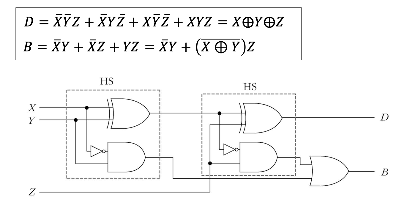 따라서 2개의 반가산기 (HA)가 모여져서 1개의 전 가산기가 구성되는 것을 알 수 있다.