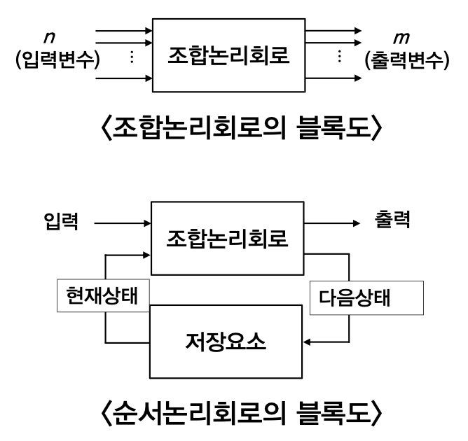순서논리회로: 조합논리회로에 저장요소를 추가한 회로 => 저장요소의 상태와 입력변수에 의해서 출력이 결정됨
