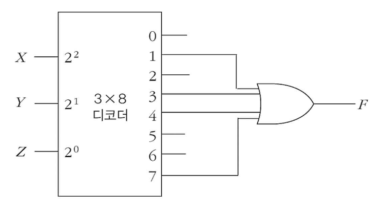 - 결국 n 개의 입력과 m 개의 출력을 가진 조합논리회로는 n×2^n 디코더와 m개의 OR 게이트로 만들수있다.
