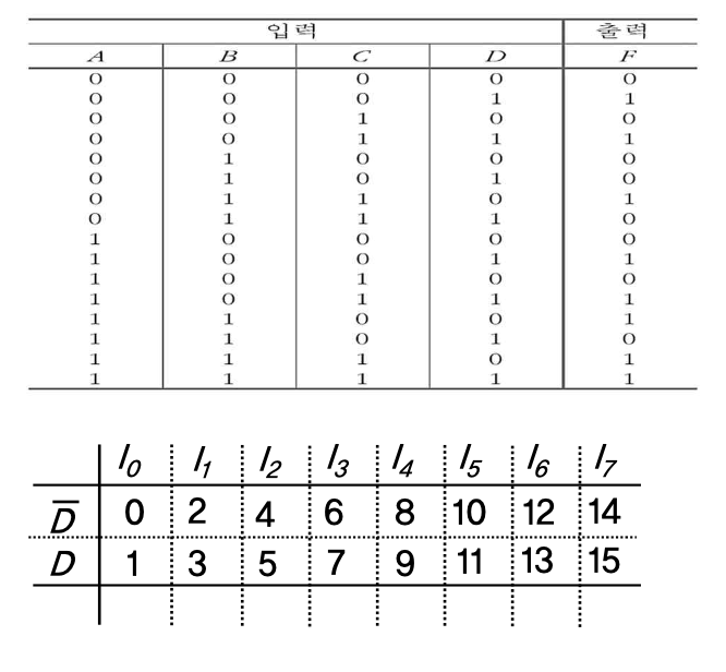 - 결국 n 개의 선택입력과 2n 개의 데이터 입력을 가진 멀티플렉서를 이용하면 n+1 개의 변수를 가진 부울함수 구현 가능