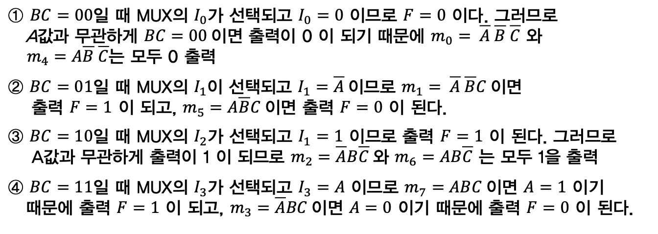 결국 NOT게이트와 AND가 디코더에서 수행을 한다면, 최소항을 이용할 수 있다. 멀티플렉서를 이용해서도 부울 함수를 구할 수 있다는 것.