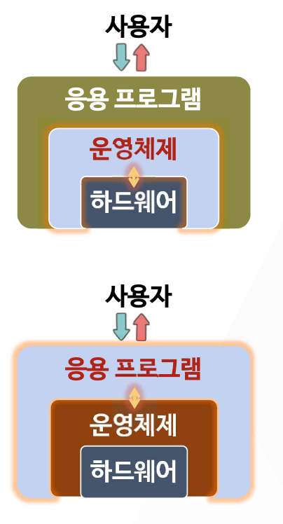 - 하드웨어와 응용 프로그램 사이에 운영체제 위치