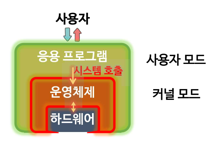 시스템 호출: 응용 프로그램이 하드웨어에 대한 제어가 필요한 경우, 운영체제에 서비스를 요청하는 메커니즘