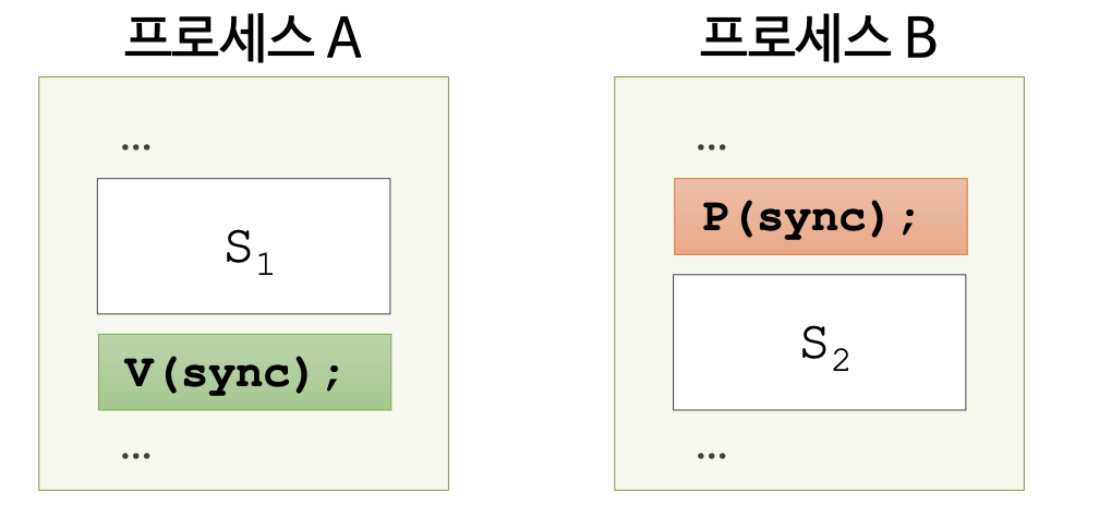 - 상황: 프로세스 A가 코드 S1을 수행한 후 프로세스 B가 코드 S2를 수행하도록 동기화