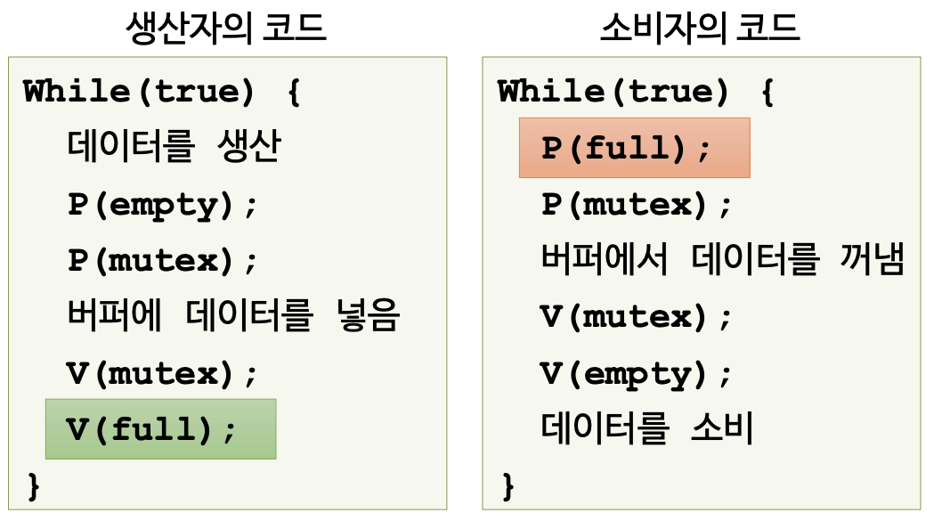 버퍼가 빈 경우 동기화: 세마포어 full (초깃값 0)