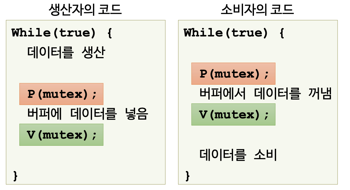 상호배제: 세마포어 mutex를 이용 (초깃값 1)
