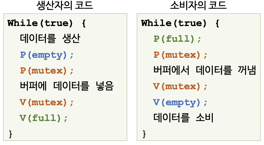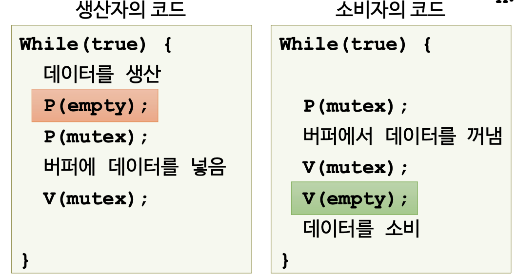 버퍼가 가득 차 경우 동기화: 세마포어 empty(초깃값 n) // n: 버퍼 크기