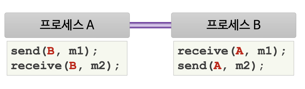 직접 통신: 두 프로세스가 직접 서로를 지정하여 메시지 전달