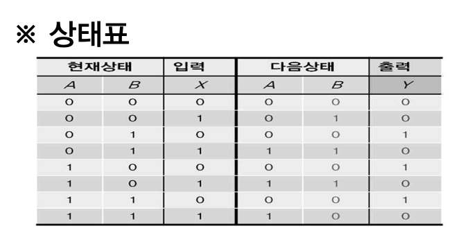 - 상태표는 현재상태, 입력, 다음상태, 출력으로 구성