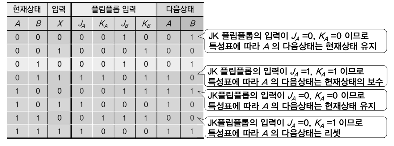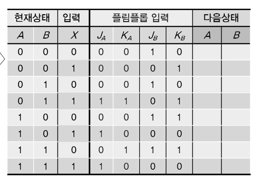 - 따라서 다음 상태를 구하기 위해서는 플립플롭 특성표를 이용하여 플립플롭의 응답을 알아야 함.