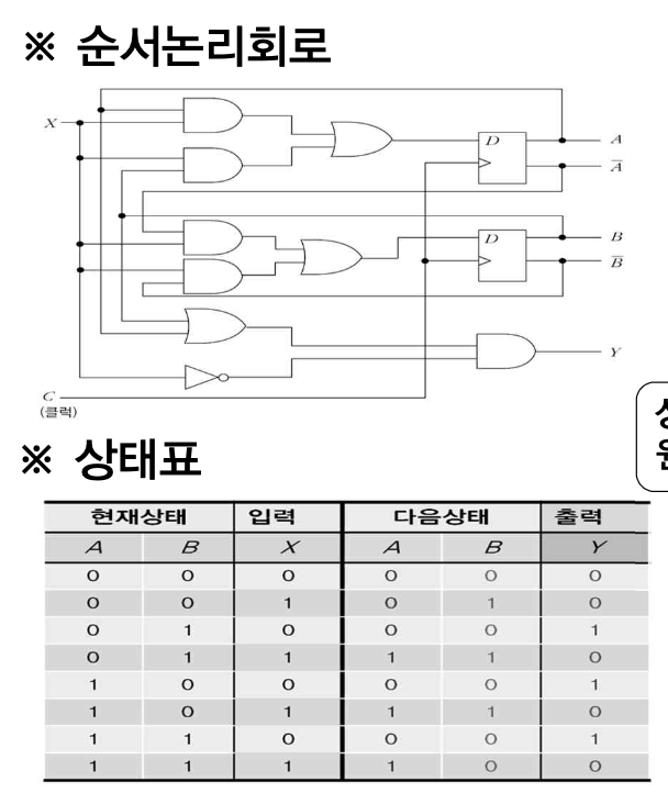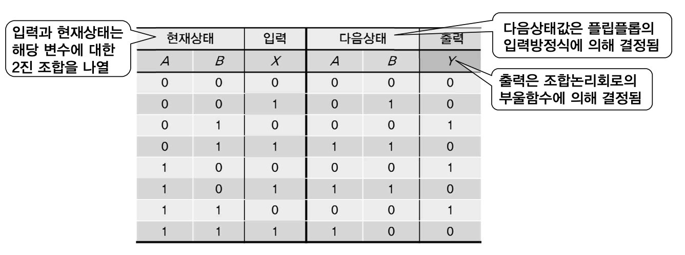 - 상태표: 순서논리회로에서 플립플롭의 상태와 입력, 출력의 변화를 나타낸 표
