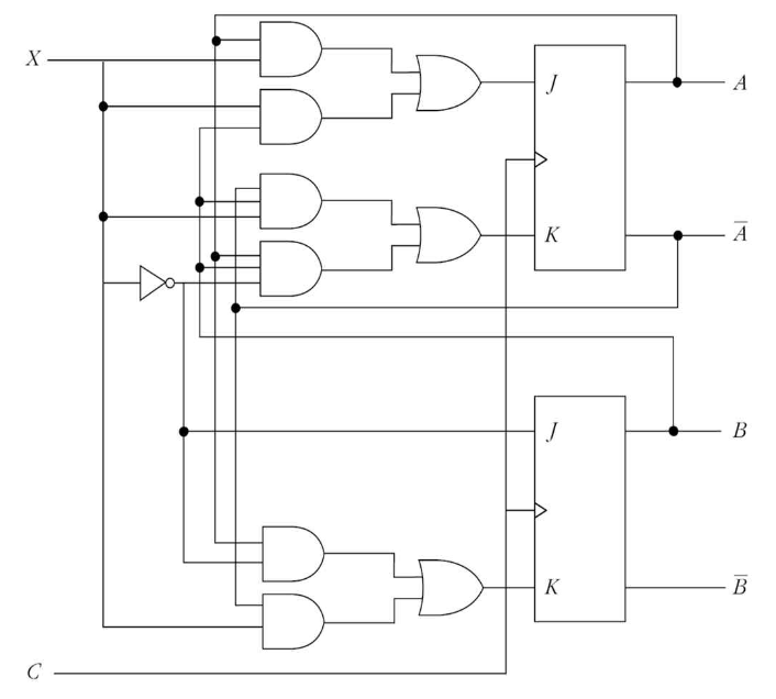 다음 회로도에서 JK 플립플롭의 입력방정식은