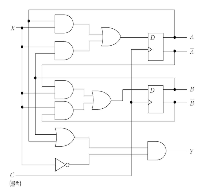 위와 같은 D 플립플롭이 두 개 장착되어 있는 순서논리회로와 상태표를 이용해서 구한 상태도