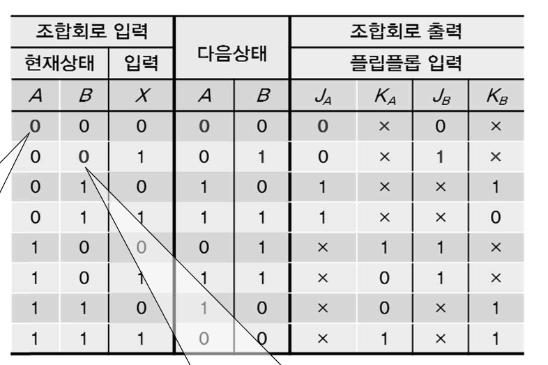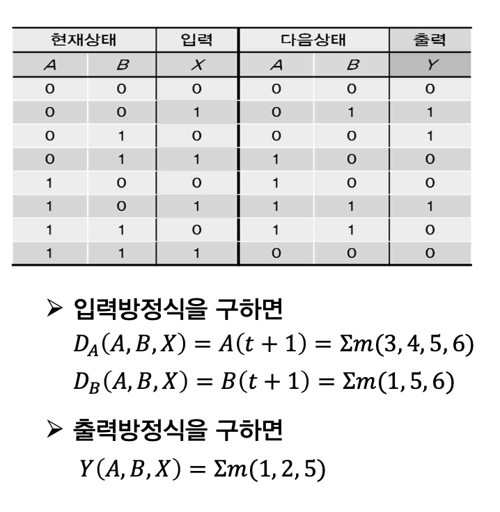 - 입력방정식을 구해 상태표 작성 (현재상태와 다음상태로 이루어진)