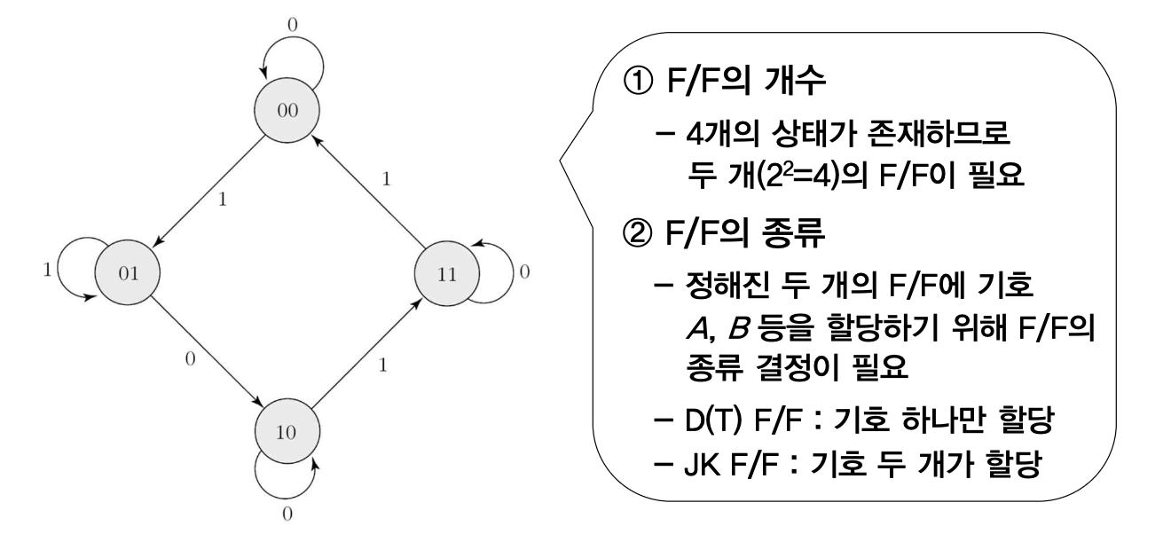 -> 순서논리회로에 사용될 F/F의 개수와 종류를 결정하고, 그 F/F에 기호를 할당