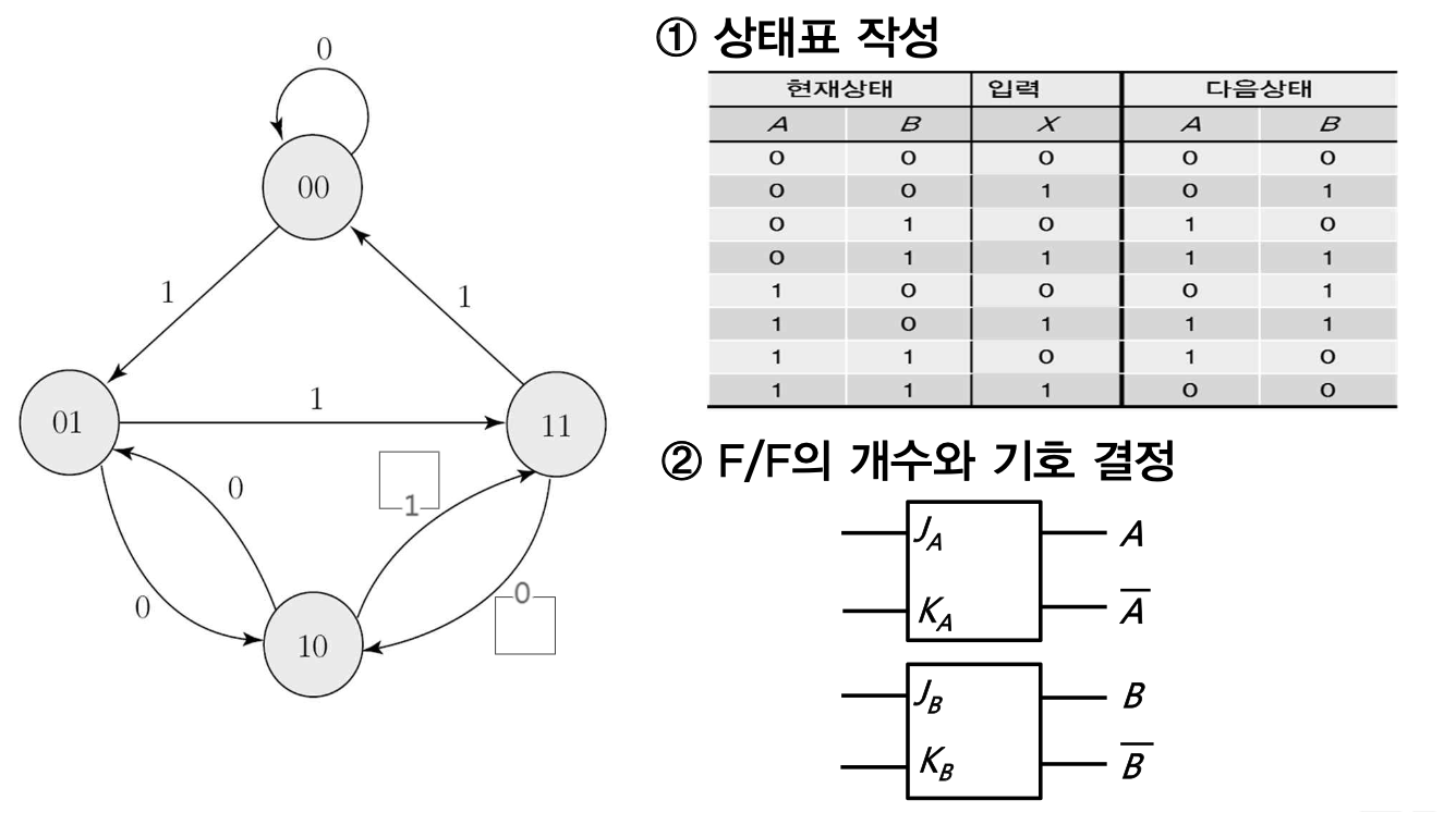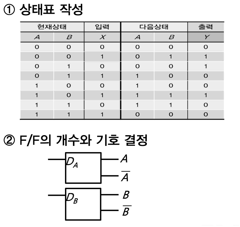 설계 명세로부터 F/F의 종류와 개수 결정 -> 상태표 작성, F/F 종류 개수 결정