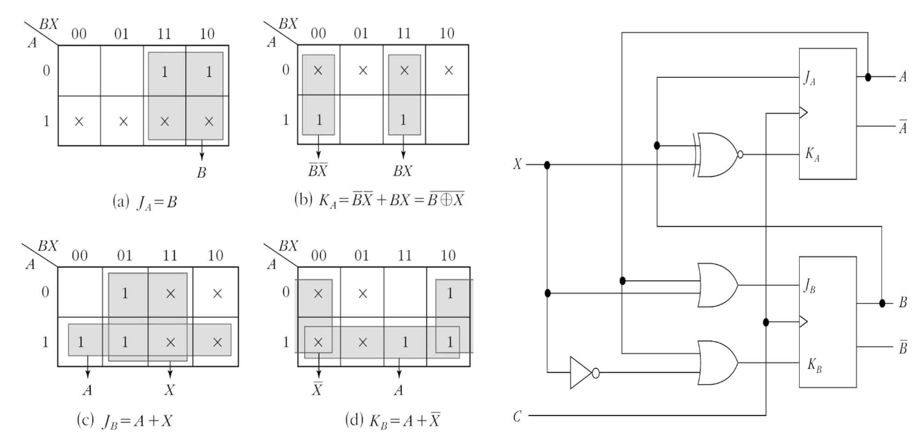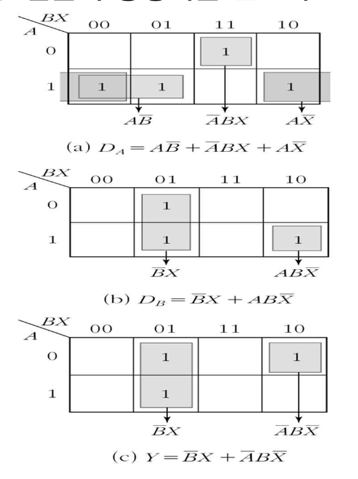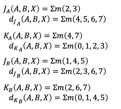 상태표를 보면 JA 의 입력방정식은 현재상태 A, B 와 입력 X 의 부울함수로 표현된다.