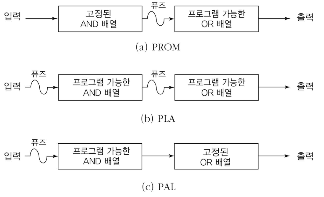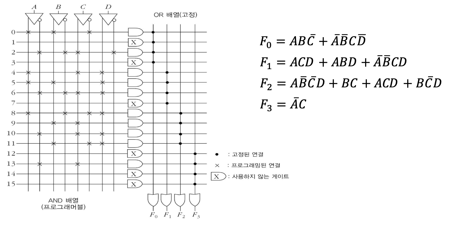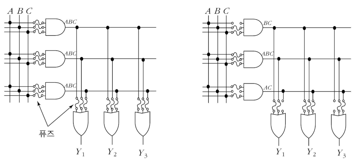- 전자 퓨즈선의 연결 유무에 의해 AND-OR 연산 즉, 곱의 합 형식의 조합논리회로 구현