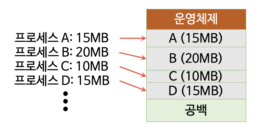 - 메모리 낭비 심함: 지속적으로 사용되지 않는 프로세스도 메모리에 계속 적재