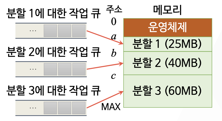 -> 분할 영역마다 큐를 두고 큐에 들어온 프로세스는 해당 분할영역에만 적재