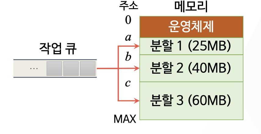 - 하나의 분할에 하나의 프로세스가 적재되는 방식