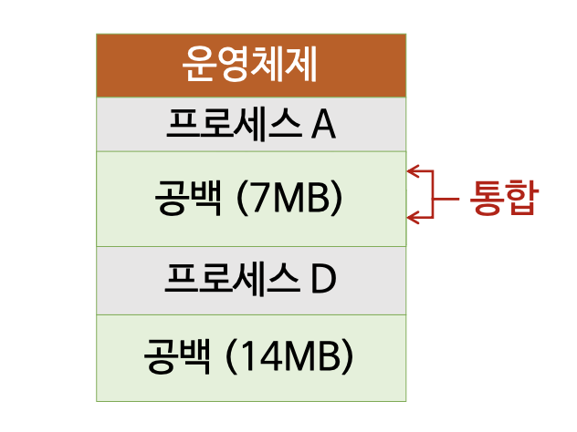 통합: 인접된 공백을 더 큰 하나의 공백으로 만들어 외부 단편화 해결