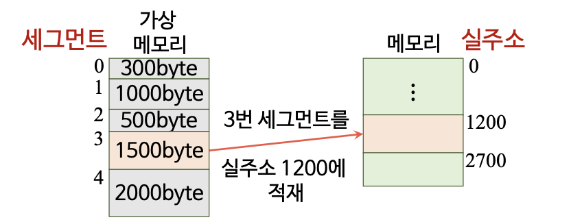 - 가상 메모리를 세그먼트 단위로 나누어 관리