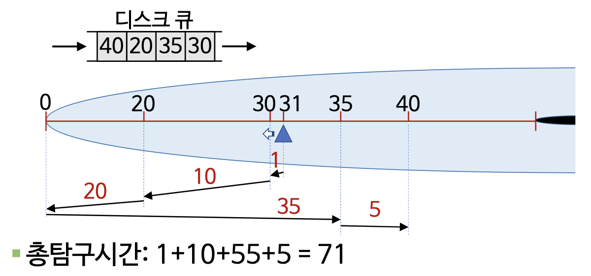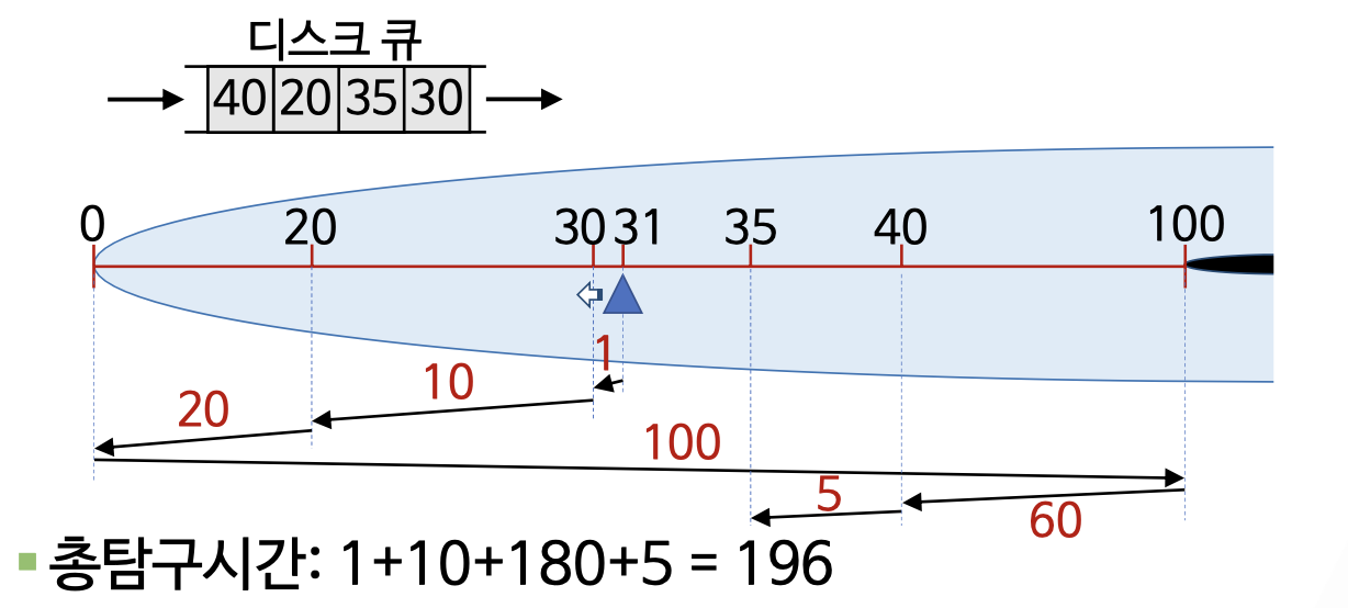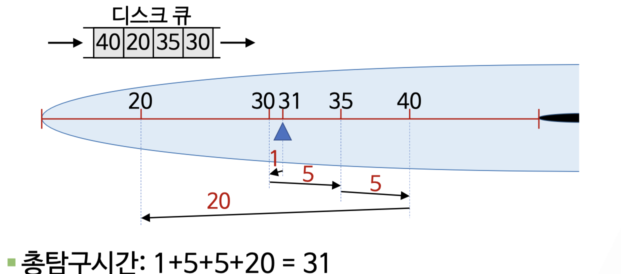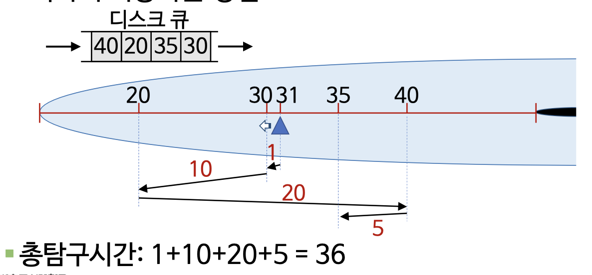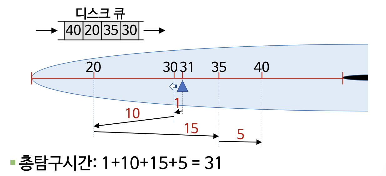 단점: 도착 순서에 따라 총 탐구시간이 커질 수 있음, 디스크 부하가 높을수록 응답시간이 길어짐