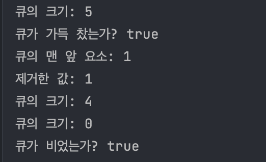 System.out.println("큐가 비었는가? " + queue.isEmpty()); // 큐가 비어 있는지 여부 출력: true