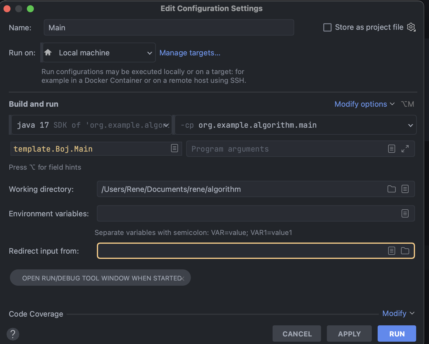 Redirect input from에 위에서 만든 텍스트의 주소를 넣어주면 된다.