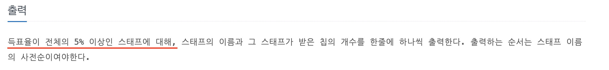 먼저 입력값을 다 받아놓고 총 투표수를 계산한 다음 그거로 5% 미만 값을 필터링 하는 방식이다.