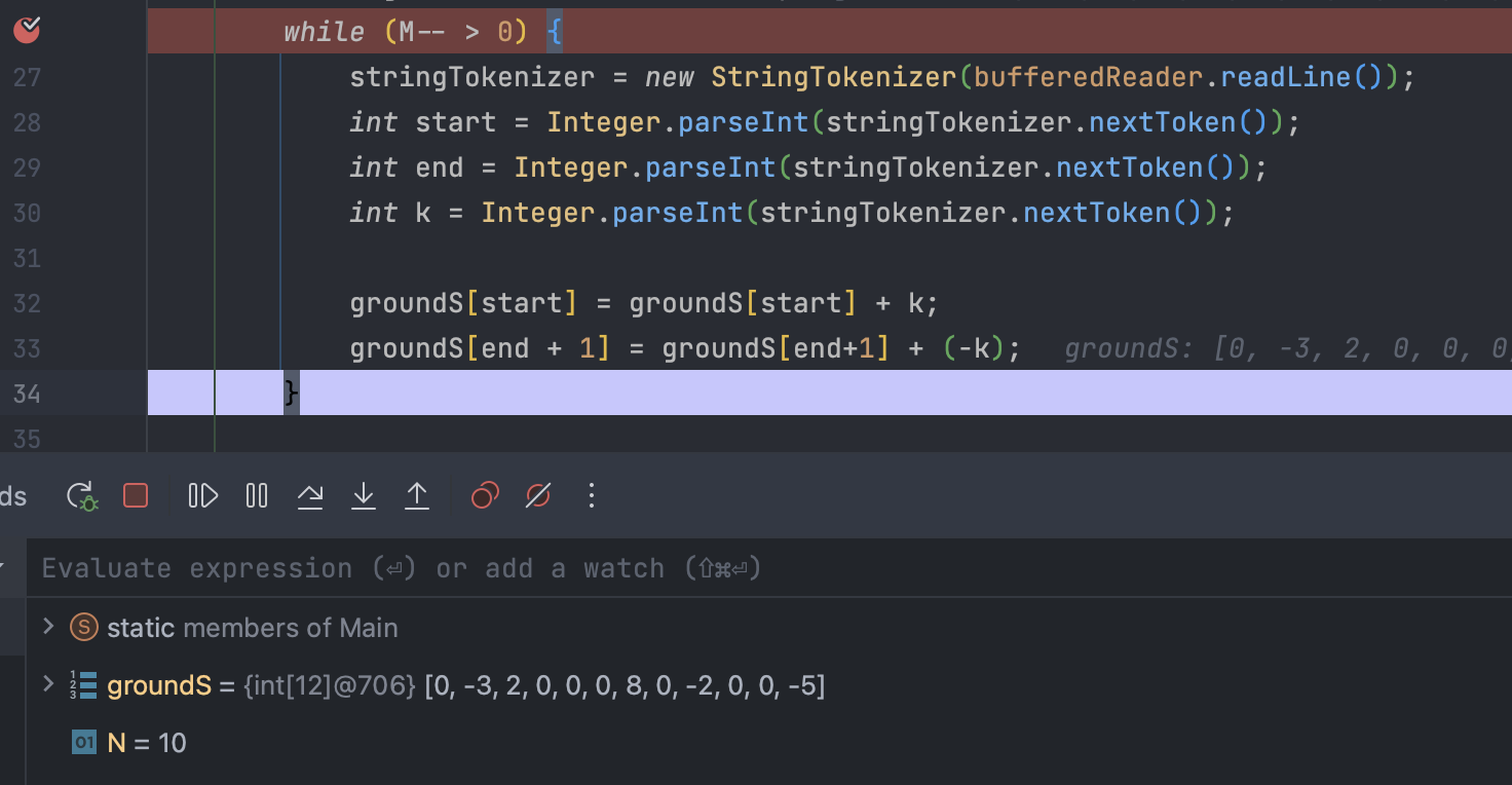 이를 누적 배열로 설정하고 있기 때문에 하나하나 값을 채워주는 것이 아니라 start부터 end까지 쭈욱 이어지는 개념으로 초기화를 시켜야 하고, 이는 각 인덱스에 따른 값은 이전 값을 통해 구해진다는 것을 의미한다.