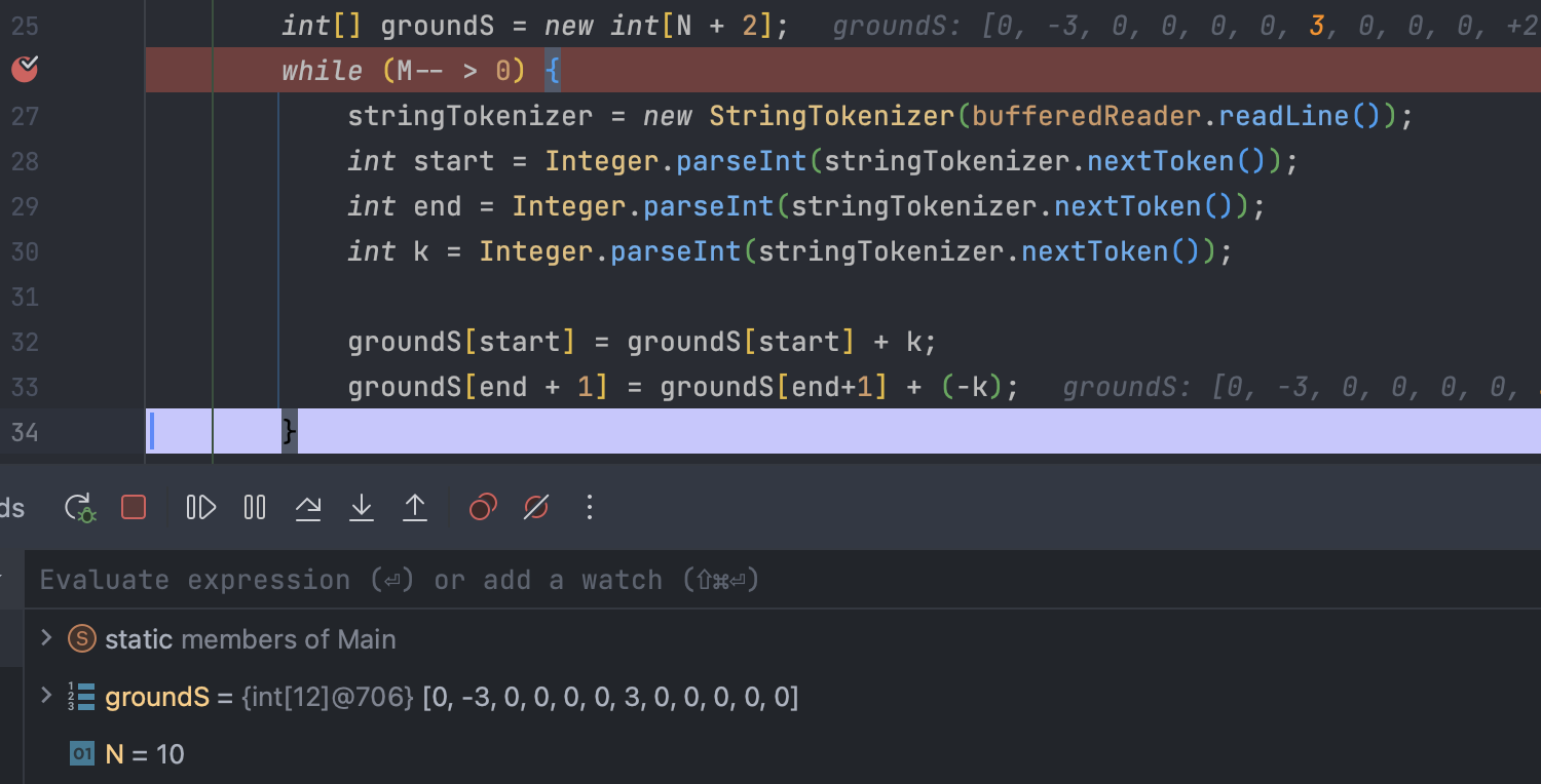 이때 끝나는 지점을 설정해주어야 하므로 1 ~ 5까지 -3이 초기 값 0과 더해지면서 -3으로 채워지고, 6부터는 이전의 -3을 다시 원상복구 해주기 위해 +3과 더해주면 이후부터는 0으로 채워질 수 있게 된다.