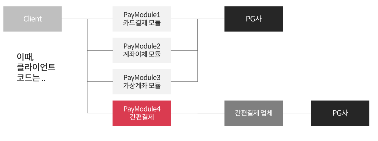 클라이언트는 Payservice를 보고 그 구현체들을 나눈다. PayService만 보더라도 구체클래스들을 알게된다.