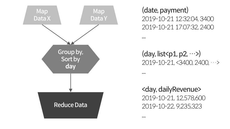 X와 Y가 있을 때 동일한 map함수가 분산처리를 하고 해당 결과에 대해 reduce한다.