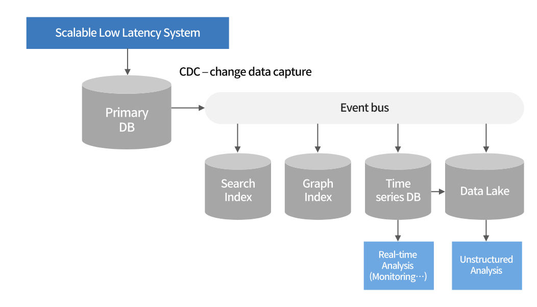 primary DB의 이벤트 버스를 두고, search Index, GraphIndex, Time Series 등에 대한 변경 사항을 감지한다.