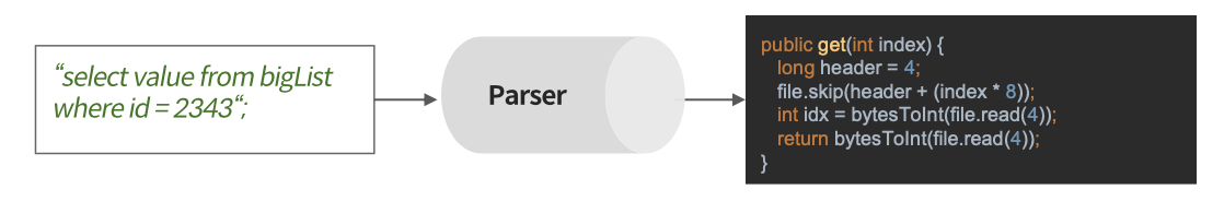 SQL은 Parser를 통해 자바 코드로 구현된 내용과 같은 컴퓨터 언어로 전환되어 쿼리를 수행하는 execution 엔진을 통해 수행한다.