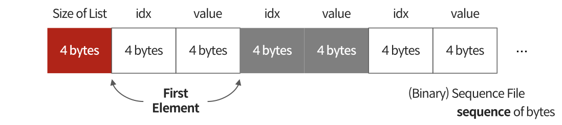 파일의 헤더에 리스트 사이즈의 값을 적고 인덱스 번호, element의 값을 하나씩 추가하는 방식으로