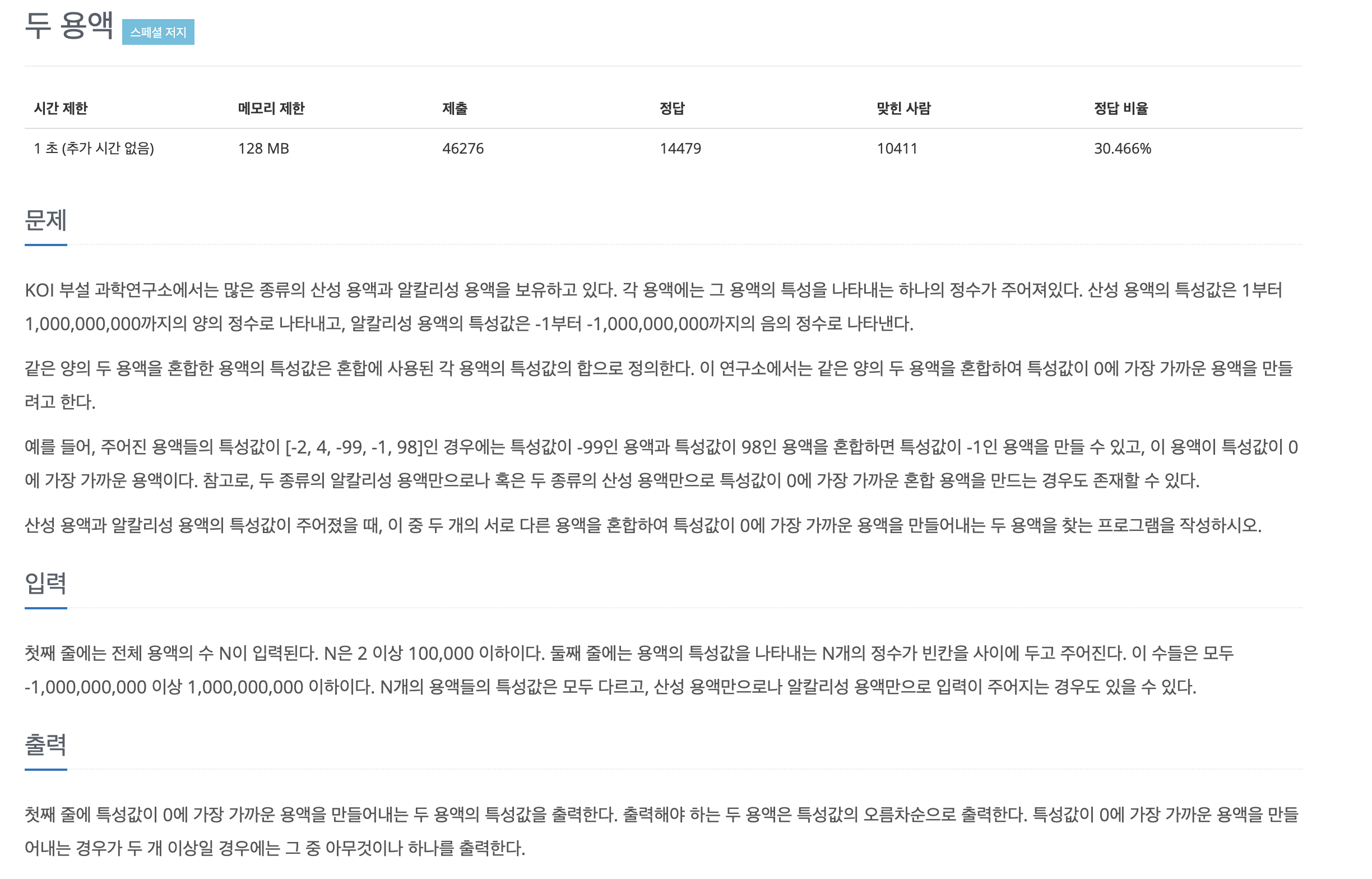 백준 2470 두 용액 (JAVA 자바 풀이)