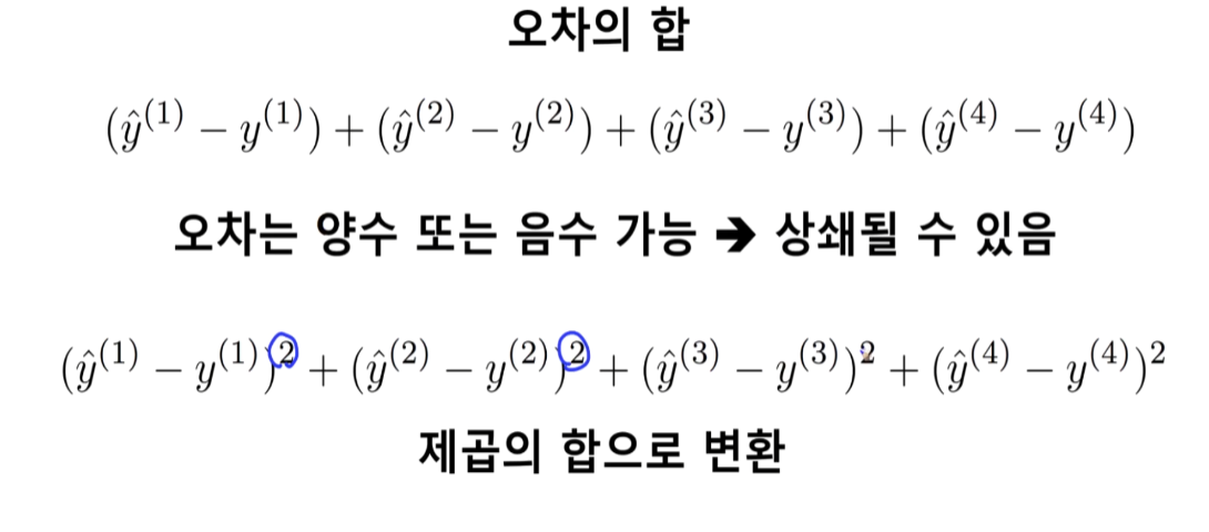 단순 오차의 합으로 하면 음수 값이 나올 수 있음 = 제곱의 형태로 표현