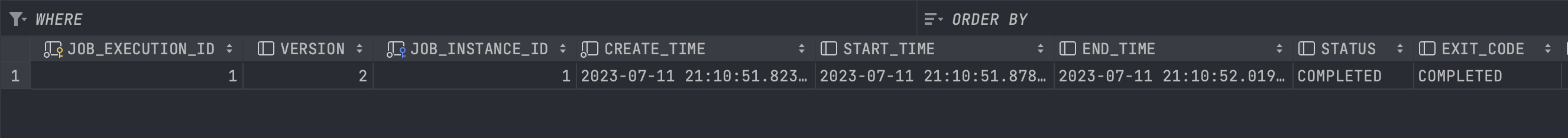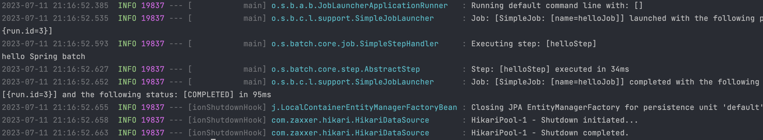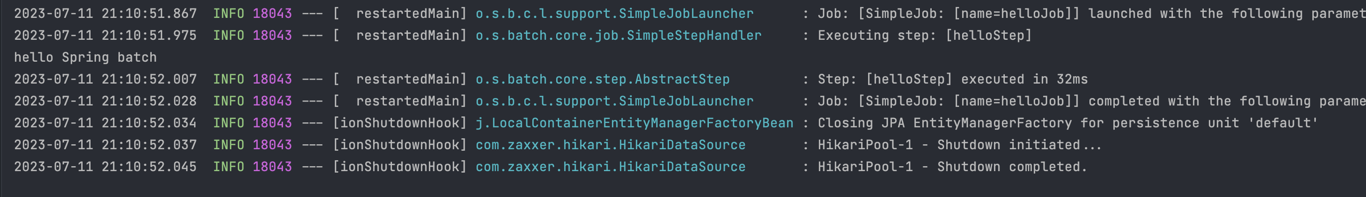 프로그램을 실행시켜 보면 실행이 되었다가 종료되는 것을 확인할 수 있다. 배치 프로그램의 경우 계속 돌아가는 것이 아니라 완료 후 종료가 된다.